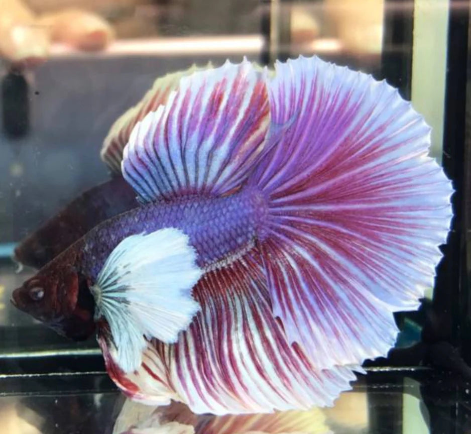Fins: They will be Halfmoon and over Halfmoons, the top fin will be very high called skyhawk and mohawk. The fins are rose tail or orchid (very wrinkled edges) or feather tail, Ventral fins are long and wide meaning they’re show grade bettas.