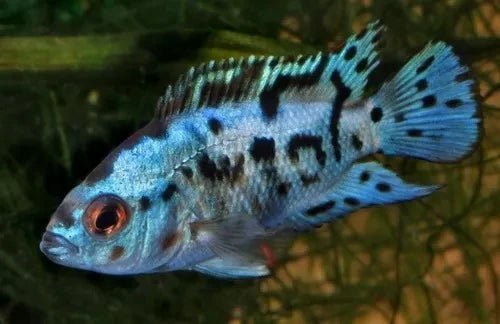 The Electric Blue Jack Dempsey is a freshwater fish that originates in the murky warm waters of Central America. It has a base color of electric blue to gray, and displays many iridescent blue and green spots, giving this fish a spectacular look. When breeding, these colors will intensify. The dorsal fin is lined in red, and the female's overall coloration is subdued compared to the male.