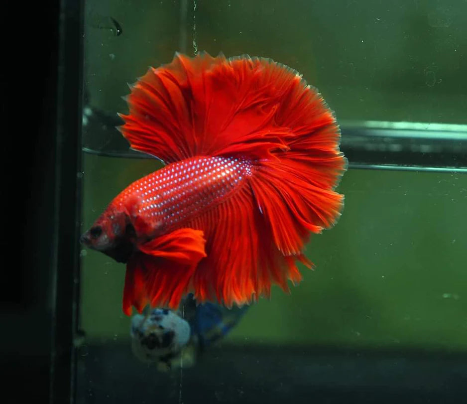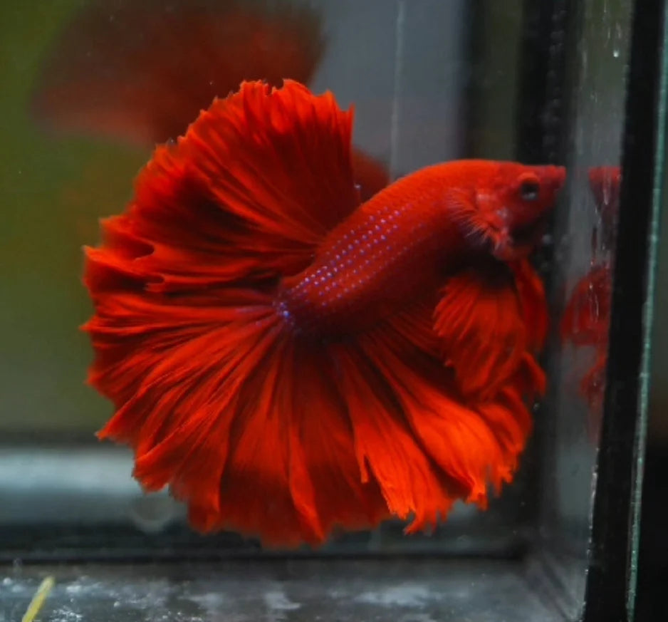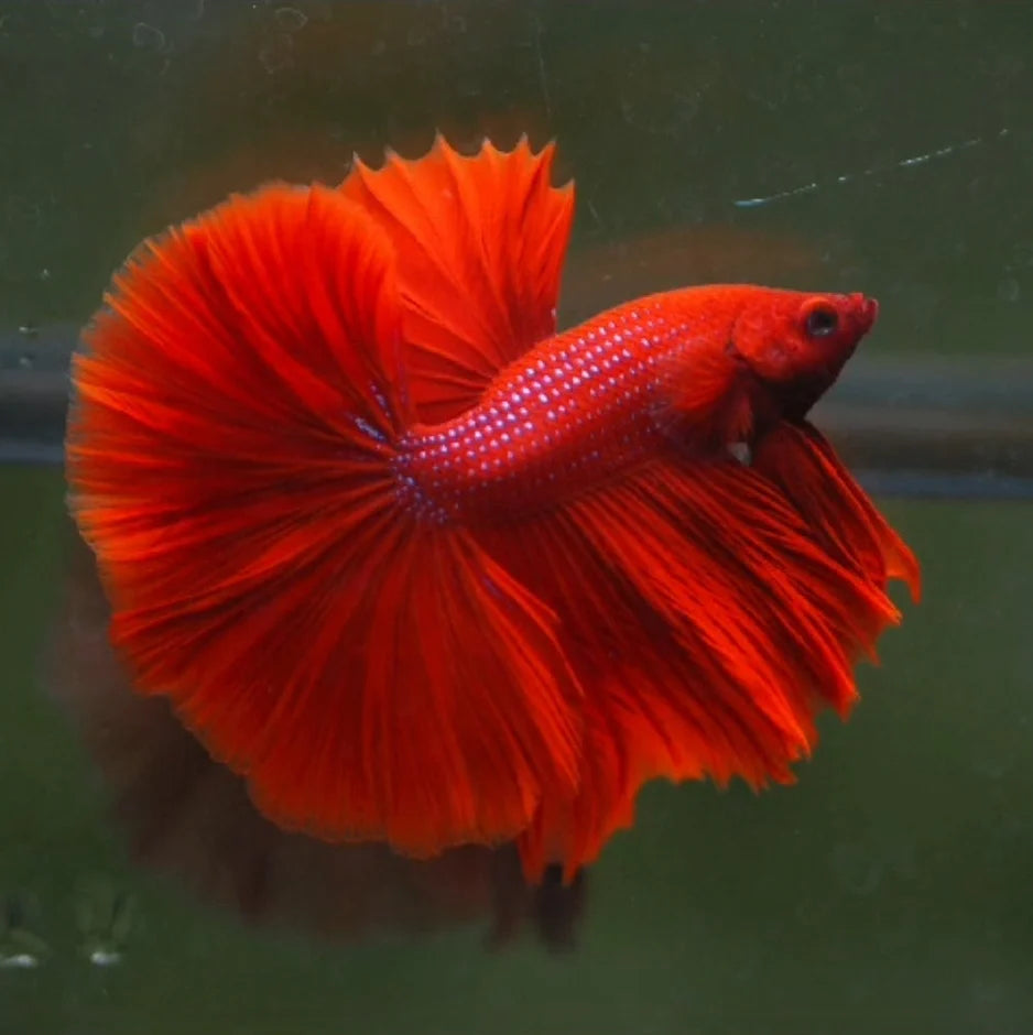 Super Red Halfmoon: Solid Red halfmoon with the most vibrant colors. They might have some pink shimmering scales. They always will have very developed big tails with rose tail edges. Some of the classic types of betta, meaning their finnage is big and beautiful.