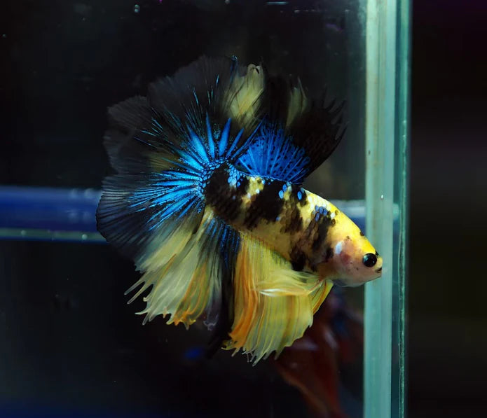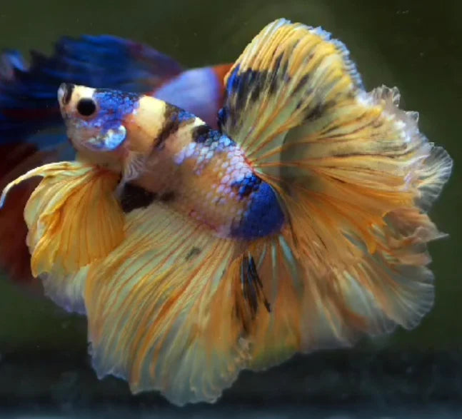 Yellow Koi and Marble: Yellow based color betta Koi Galaxy or Marble gens, they will have some dragon scales blue, white or green. Making them bright and colorful. They'll coloration of; blue, white, green, galaxy, fancy, over the base color yellow of their bodies. Fancy Big Tails.